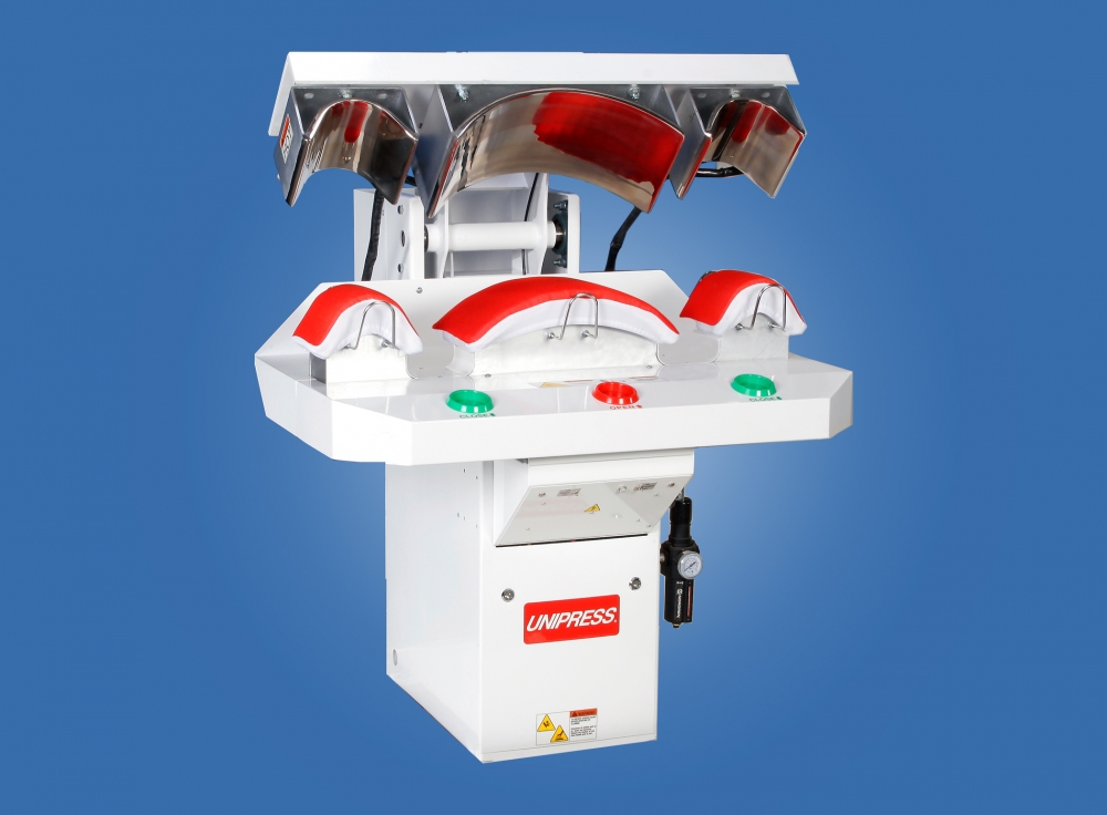 The Unipress WCZ Double Tensioning Collar & Cuff Press finishes 2 shirts at once.