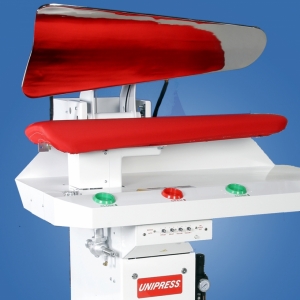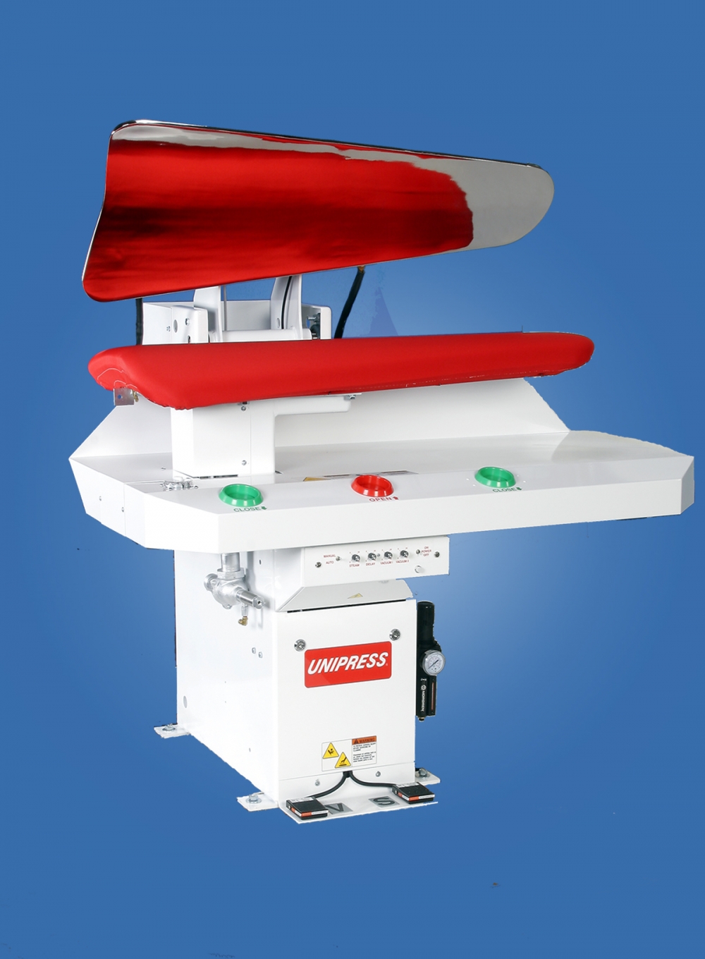The perfect combination to improve your quality and increase your production. These presses are specifically designed to help you conquer the challenges of a changing market. The 46XH features highly polished, nickel plated heads. The open chamber design of the head facilitates an even heat transfer across the head. Thus, providing the tempuratures necessary to quickly finish cotton pants. The 46XH features an automatic cycle that allows the operator to top while the legs are being finished. The 46XH is built with Unipress' exacting standards. Each press is equipped with microprocessor controls and has self-diagnostic capabilities. The microprocessor assures reliability and ease of trouble shooting. The fast smooth opening and closing of the head are enough to make any presser feel comfortable and confident to provide quality pressing results.